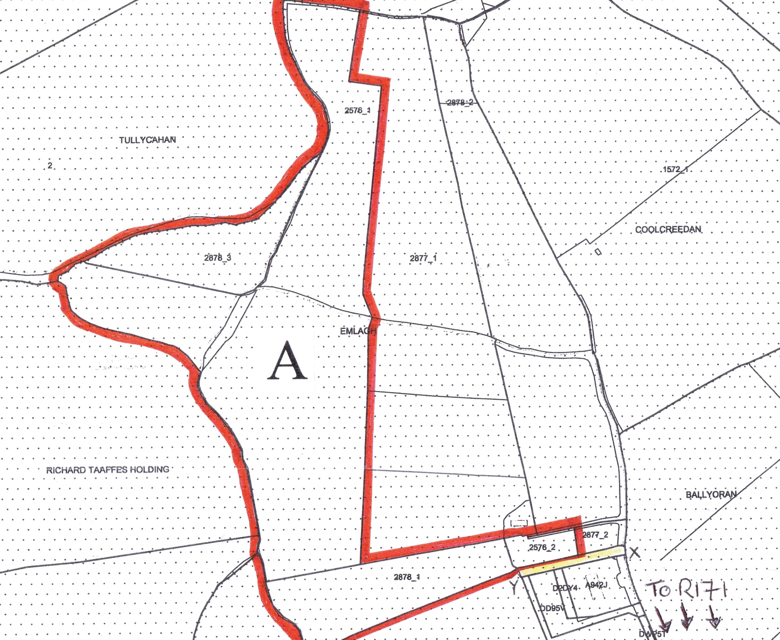 The lands marked “A” on the above map comprise c. 8.77 Hectares/c.21.67 acres of good quality grazing, in two good sized divisions.   They are a short distance from Louth Village.